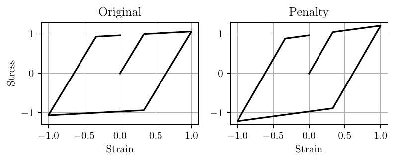 No source code, no problem–re-coding the PenaltyMaterial was easy. Below is an example with the penalty stiffness equal to 5% of the initial stiffness; although when using this wrapper you’ll want to specify a much smaller value.