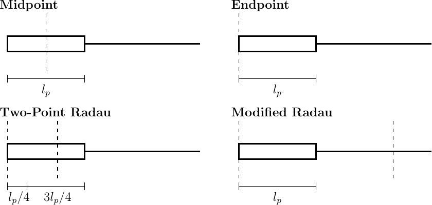 Midpoint integration was thrown out for failing (1) and (2) (by a hair), endpoint integration failed (2) for giving a solution that was too flexible, and two-point Radau didn’t satisfy (3). The last method left standing was modified Radau, which as it turns out, can lead to negative integration weights in some cases.