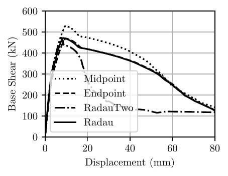 Focusing on the yield point for only endpoint and modified Radau hinge integration, we see that the yield displacement for endpoint integration is larger than that for modified Radau–by about 1.2 mm, a little more than the thickness of a dime. The peak base shear differs by about 2 kN, also due to numerical integration error.