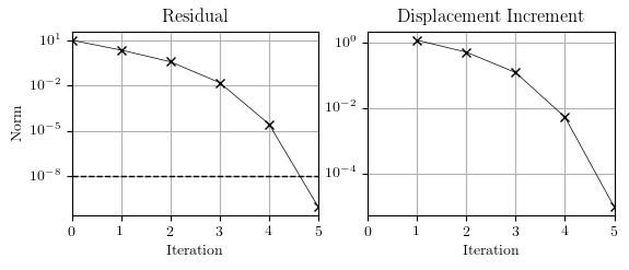 Using standard Newton-Raphson with a regular equation solver, the residual and displacement increment reduce quadratically.