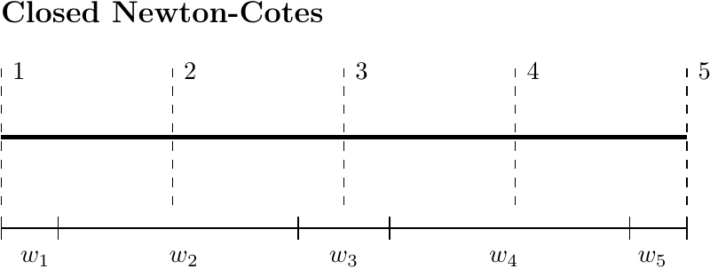 One specialized case is Newton-Cotes integration, where the integration points (abscissas) are equally spaced–useful for recording internal forces and deflections at uniform intervals along a frame element. There are open and closed versions of Newton-Cotes, with the closed version preferred for force-based frame elements because it puts integration points at the ends. The closed N=5 case is shown below.