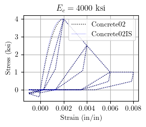 Comparisons of Concrete02IS and Concrete02 are shown below using a range of initial stiffnesses for Concrete02IS: