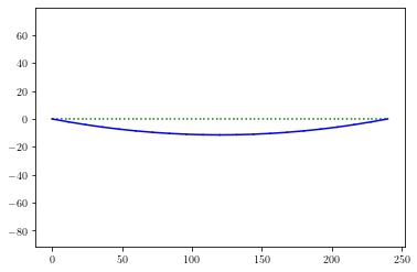 The deflected shape of the cable (drawn using opsvis) is shown below with a 10x scale factor.