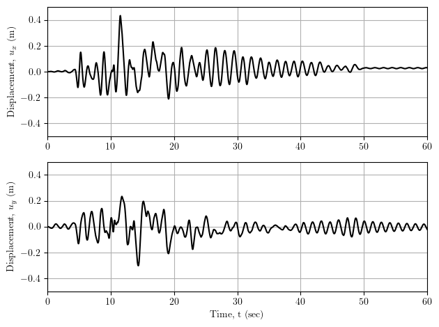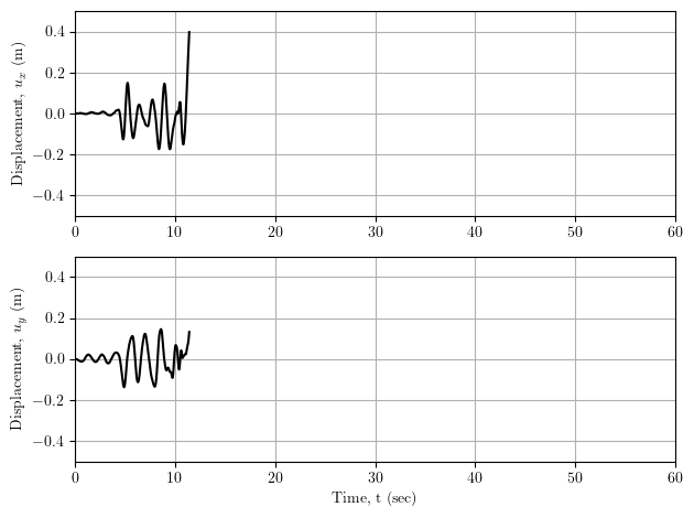 Here is the displacement response in two orthogonal directions at the top of a nearly 50 m tall structural model subjected to two components of earthquake ground motion. The analysis fails to converge at about 11 seconds into a 60 second simulation.
