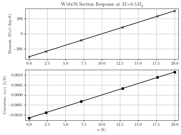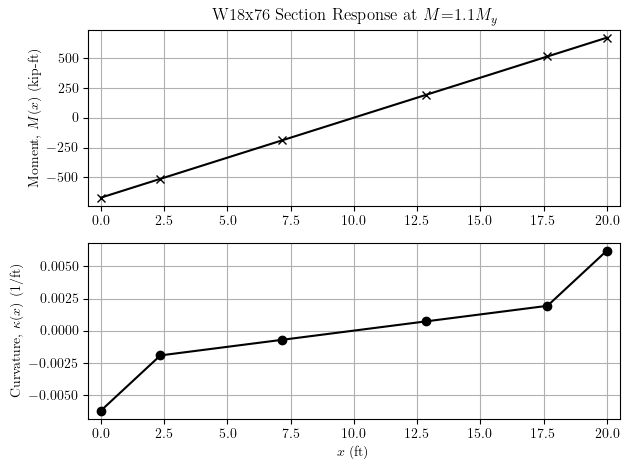 Using these recorders, it’s easy to plot the internal distributions of moment and curvature for a frame element. Consider the W18x76 shown below loaded in anti-symmetric bending.
