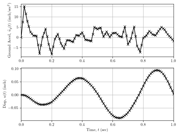 Points are linearly interpolated from the input ground acceleration and the displacement response changes slightly, e.g., the maximum displacement over the brief 1 sec analysis changes from 0.09306 inch for the 0.02 sec time step to 0.09431 inch for 0.01 sec.