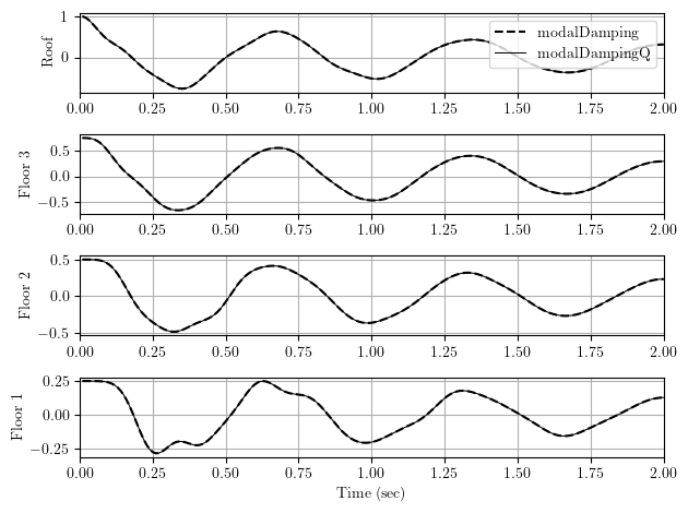 Imposing a unit value of roof displacement as an initial condition, the free vibration response history of the three floors and roof is shown below. Both modal damping and “quick” modal damping give the same response.