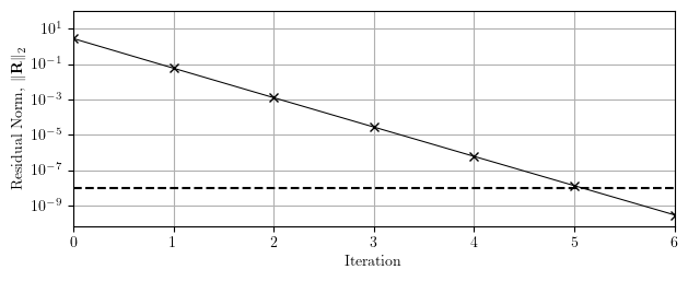 However, with “quick” modal damping, the damping matrix is not assembled and the dynamic tangent becomes inconsistent with the residual, i.e., there are damping forces, but the dynamic tangent only has mass and stiffness contributions. As a result, quick modal damping requires multiple iterations per time step for a linear analysis, no matter which solver you use. The Newton algorithm converges in seven iterations in the first time step of the shear frame analysis as shown below. You could cut that down to five iterations if you use KrylovNewton.
