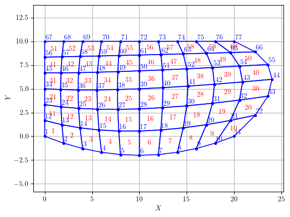 This produces the model shown below (plotted using opsvis) with 77 nodes and 60 elements.