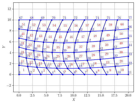 ops.block2D(10,2,nodeStart,eleStart,'quad',*eleArgs,*points)