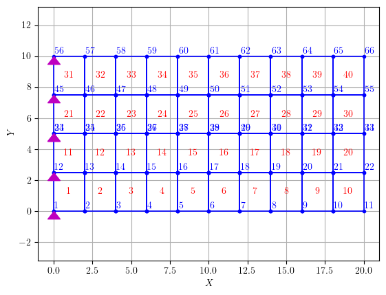 The above meshes show general features, but usually you will define regular meshes in layers using multiple calls to the block2D command. In this case, you need to ensure you pass starting node and element tags that will not cause a conflict. Instead of a magic number, pass in one more than the largest tag already defined.