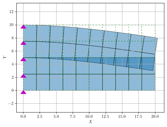 Notice in the above mesh there are collocated nodes along the mesh boundary. Without further model adjustments, applying a load, e.g., at the free end, leads to an incompatible solution.