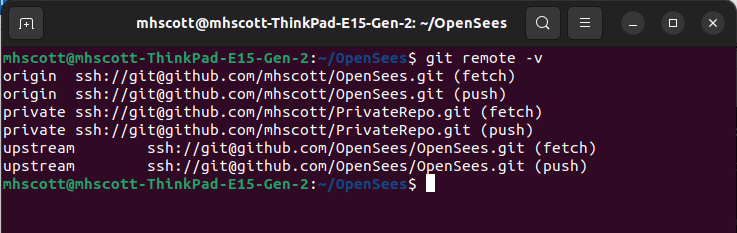 The addresses show that origin points to your public fork of OpenSees, username/OpenSees.git, while upstream points to the main OpenSees repo, OpenSees/OpenSees.git.