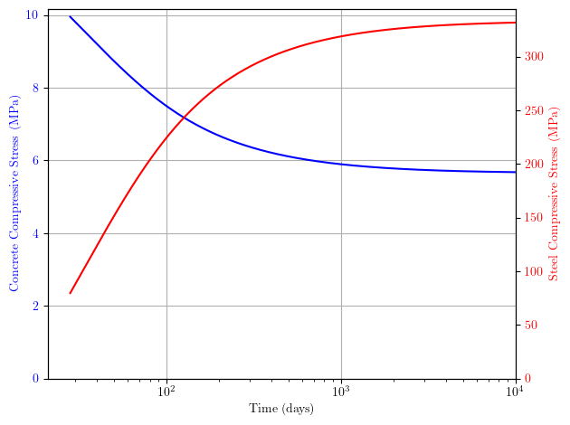 Either way, plotting the concrete and steel stress response, which you can record from the fibers, we see that as the concrete stress reduces due to creep, the steel compressive stress increases in order to maintain equilibrium with the sustained load. The concrete and steel compressive stresses at 10,000 days match the 5.8 MPa and 326 MPa values shown by Gilbert and Ranzi.