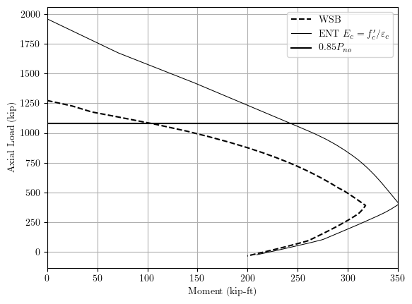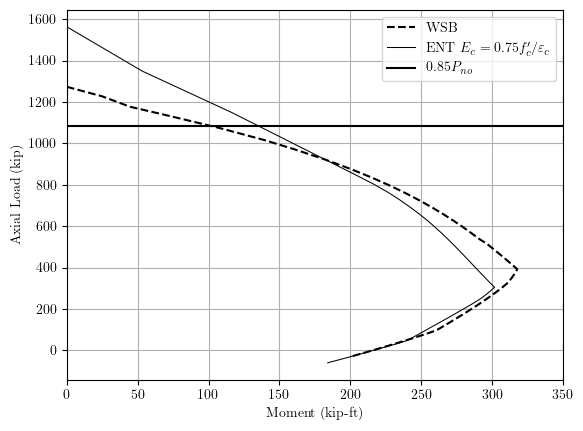 Reducing the ENT stiffness, e.g., to =1500 ksi, gets the interaction curve closer to WSB, but we’re starting to shoot in the dark. However, remember that the WSB is also an approximation–not the right answer. It’s reinforced concrete after all.