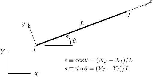 For two-dimensional elements, the vector v is defined automatically as [0,0,1] (step 2), pointing directly at you, perpendicular to the X–Y plane. Then, applying steps 3 and 4, you get y = v cross x = [-s,c,0] and z = x cross y = [0,0,1]. There’s no need to go through the cross-product calculations for two-dimensional models–y will always be [-s,c,0] and z will always be [0,0,1].