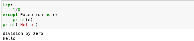 With the Exception caught, the script is able to move on–despite the divide by zero–and print Hello to the screen.