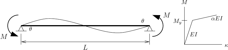 Then, a single displacement-based element with two, four, and six Gauss-Legendre integration points and a single force-based element with three, four, and six Gauss-Lobatto points give the computed moment-rotation response shown below.
