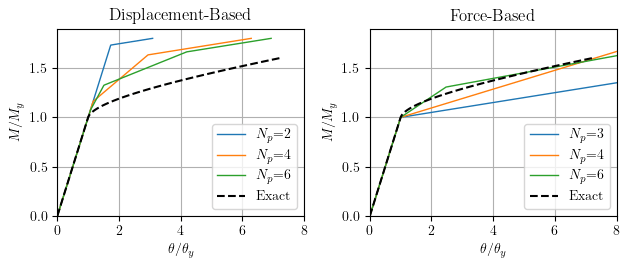 With a single displacement-based element, the computed response is stronger and stiffer than the exact solution. On the other hand, a single force-based element gives the correct strength, but is generally more flexible than the exact solution.