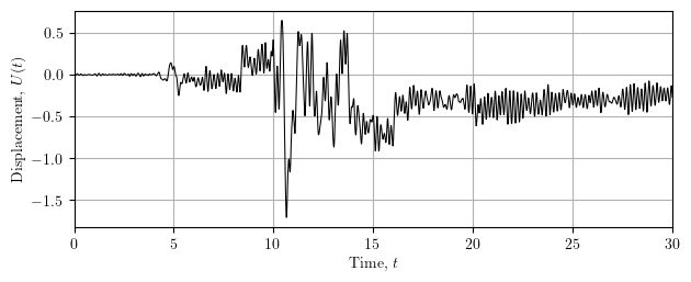 The DDM also works in dynamic analysis. Subjecting the truss model to uniform excitation and assigning 2% mass-proportional damping gives the displacement response history shown below.