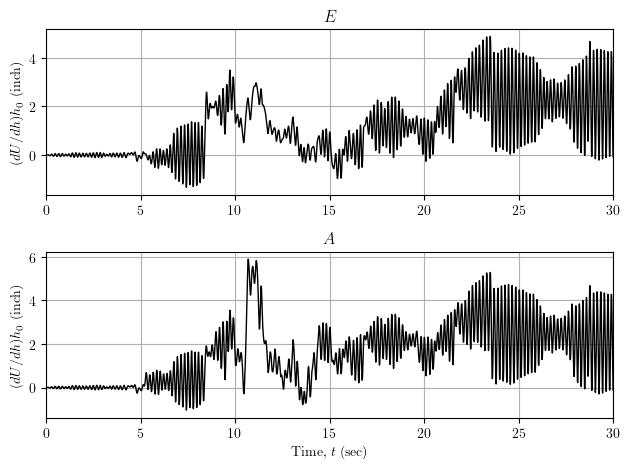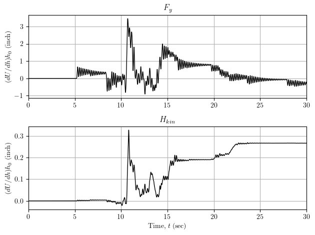 There’s a lot to imbibe in the plots of displacement response sensitivity: large oscillations in the sensitivity with respect to “elastic” parameters E and A and little bouts of damped free vibration in the sensitivity with respect to Fy and Hkin. I probably should have used a sine wave instead of a ground motion.