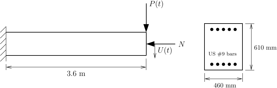 Similar to the first example, the third example is a cantilever subjected to cyclic transverse loading, except here the material is reinforced concrete. The section is discretized into 20 layers of concrete with strength f’c=28 MPa and steel bars with strength fy=420 MPa. A constant axial load equal to 10% of the section gross capacity is applied.