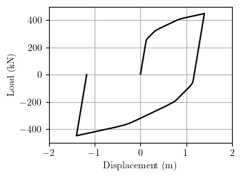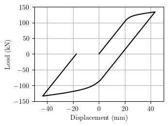 The load-displacement response is shown below for a cyclic load of peak magnitude 260 kN.