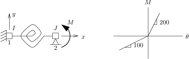 Consider the zero length rotational spring shown below. The moment-rotation behavior of the spring is defined by a material with k=200 and k=100 for positive and negative deformation, respectively. The local x– and y-axes of the element are parallel to the global X– and Y-axes. A counter-clockwise moment of M=10 is applied at node 2. This applied moment represents flexural demand from whatever would be connected to this spring in a frame model.