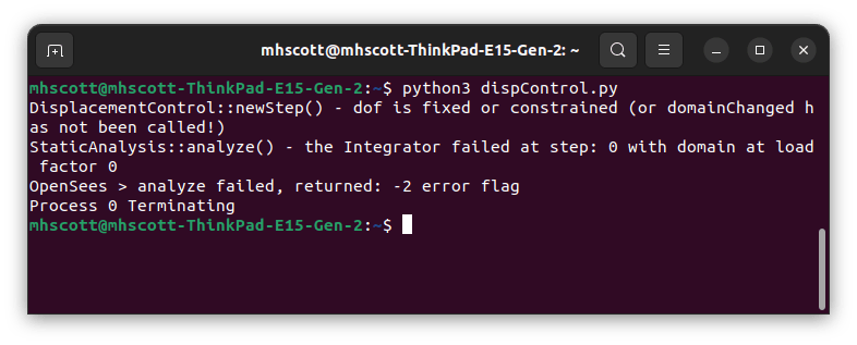 Displacement control requires a reference load pattern, a linear time series, and a nodal DOF to control during the analysis. This post will address ways to win and lose at displacement control in OpenSees.