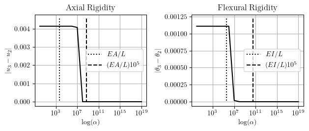 When the axial rigidity of element 2 is enforced, the horizontal displacements of nodes 2 and 3 should be equal. Likewise, the rotations of nodes 2 and 3 will be equal when the flexural rigidity of element 2 is enforced.