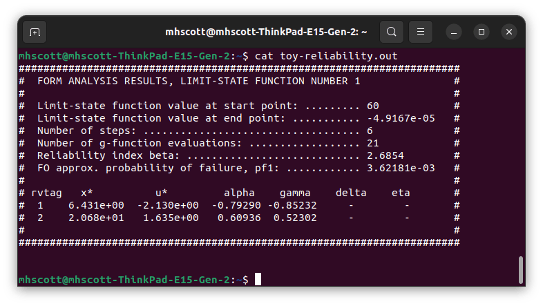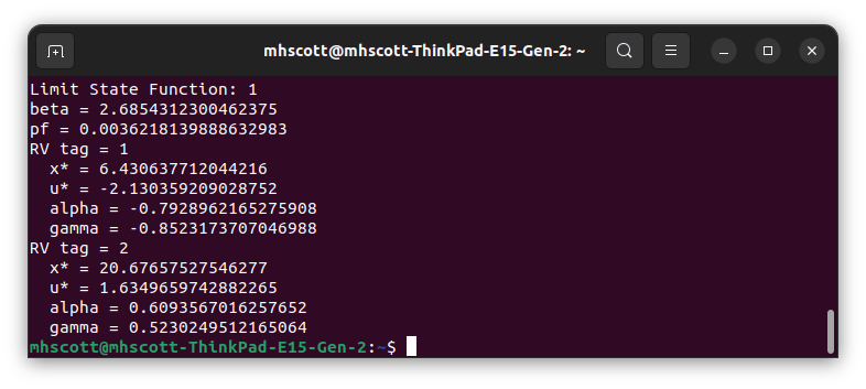 In addition to screen output, the output file generated by the FORM analysis contains the number of steps required to find the design point as well as the reliability index, probability of failure, and the value of the random variables at the design point.