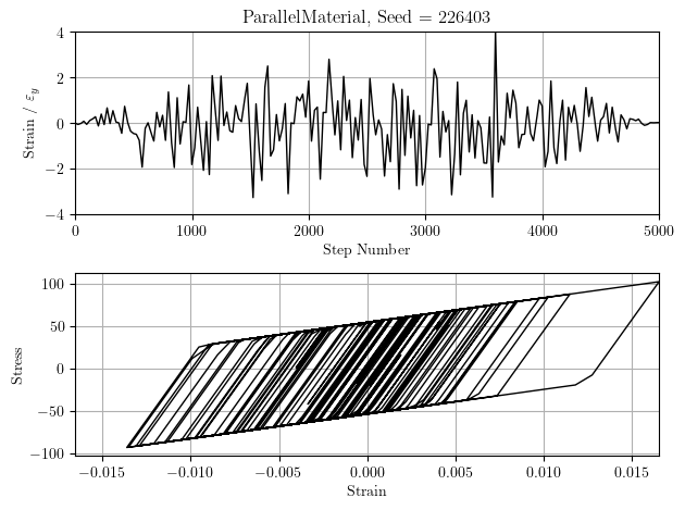 The stress-strain response due to white noise strain history is shown below. The behavior is bilinear with kinematic hardening.