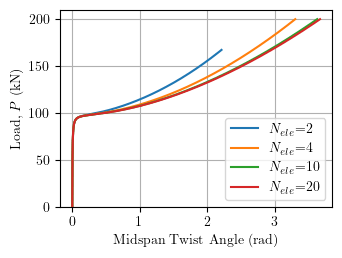 As described in the 2016 report, the theoretical buckling load is P=98 kN. The post-buckling response converges with 10 elements and matches an Abaqus analysis with 3600 S8R shell elements (also described in the report). The final twist angle is 3.67 radians, or about 210 degrees!