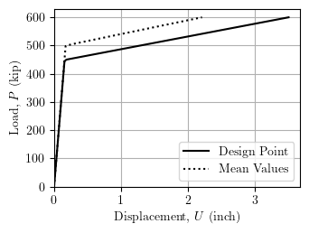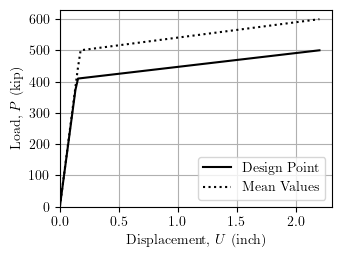 The output file includes the reliability index, design point realizations of the random variables, and the importance measures, along with other information. The load-displacement response of the truss is shown below for the mean values of the random variables and the realizations at the design point.