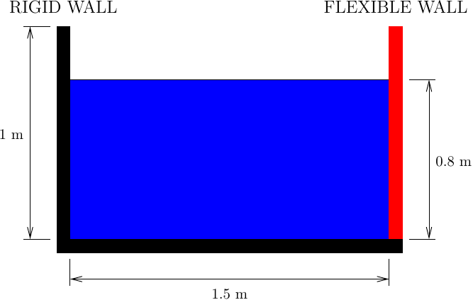 Suppose the right wall of the tank shown below is a 1.25 cm (1/2 inch) thick steel plate, which we can model with beam elements in two dimensions. The left wall and the bottom of the tank are fixed and rigid.