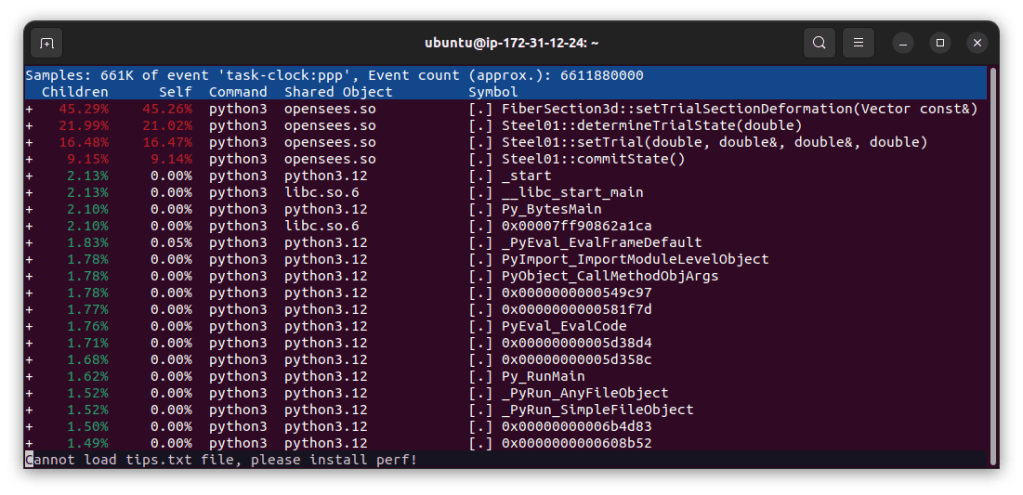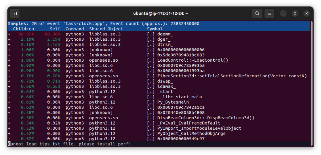 To profile the source code of OpenSees, not just the Python commands that wrap the source code, you can use the perf command and profiler. I don’t want to get into all the details of using perf, but you can find more information from the following sites, upon which most of this post is based: