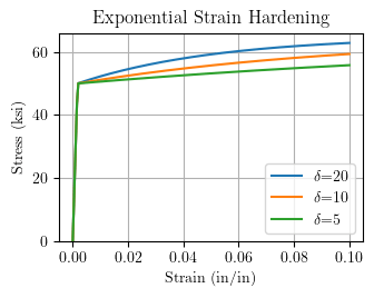 To turn off exponential strain-hardening, set , then you will be left with only the linear strain-hardening term, H, in the hardening function. A range of linear strain-hardening values are shown below with E=29,000 ksi,