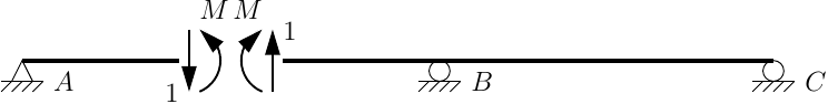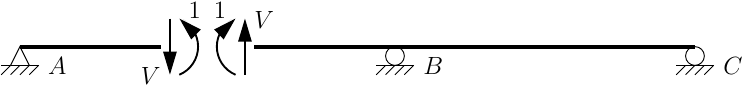 Likewise, we would insert a shear release and apply a unit internal shear in order to obtain the influence line for internal shear at midspan. The shear release transmits non-zero moment, M.