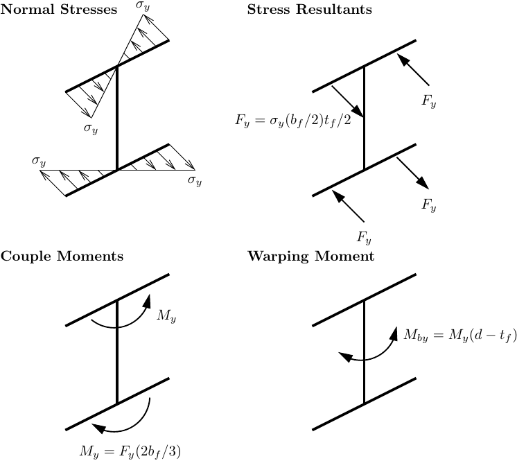 Getting from the normal stress distribution to the yield warping moment requires three steps: from normal stresses to stress resultant forces, then stress resultant forces to flange couple moments, and finally flange couple moments to warping moment.