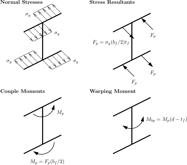 We can get from the normal stress distribution to the plastic warping moment in the same three steps as before. Note that the stress resultant forces and moment arms in the flange differ from those at first yield.
