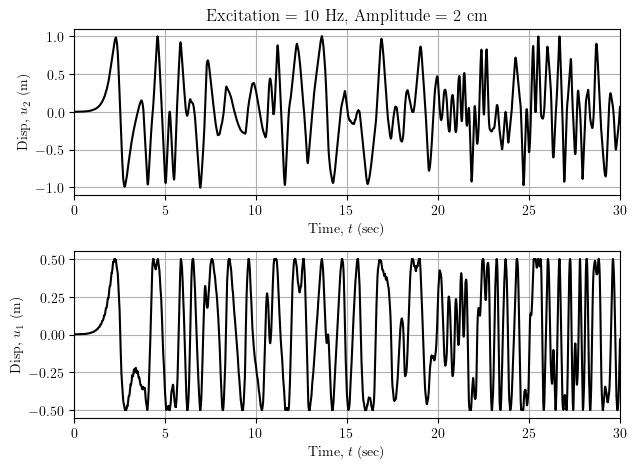 Now, if we excite the base vertically at 10 Hz, the DIP response remains chaotic with both masses spinning rapidly toward the end of the simulation.