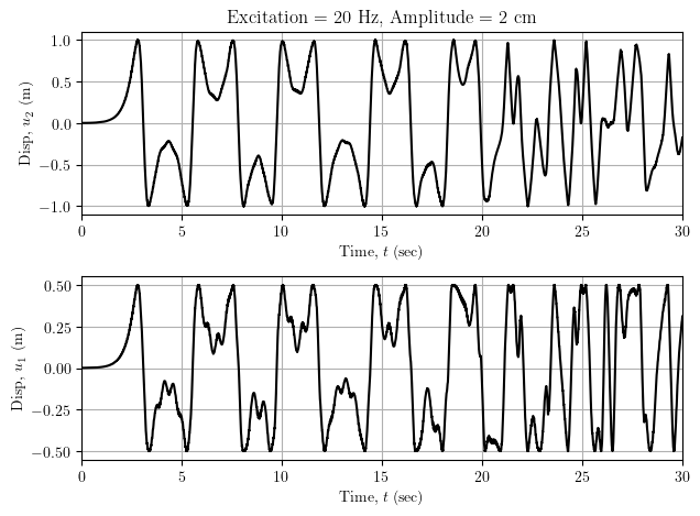 At a vertical excitation of 30 Hz, the DIP slowly leans prior to oscillating like a single pendulum. The masses stay in phase with some slight “higher mode” effects.