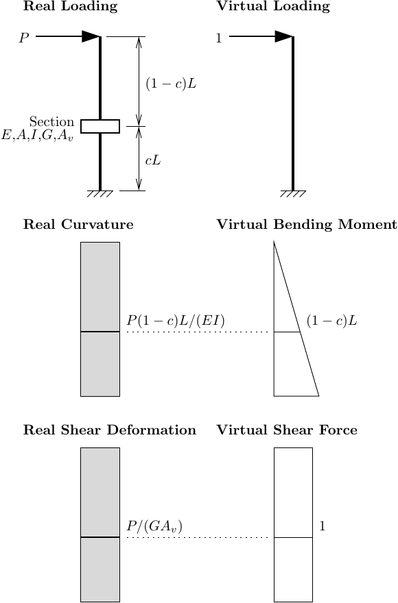 For a lateral load P applied at the free end, the bending moment is P(1-c)L and the shear is P at the section location. Then, the section curvature and shear deformation are P(1-c)L/(EI) and P/(GAv), respectively. These section deformations are assumed constant over the entire element length, giving the “real” curvature and shear deformation shown below. The virtual loading leads to virtual moment and shear equal to (1-c)L and 1, respectively, at the section location.