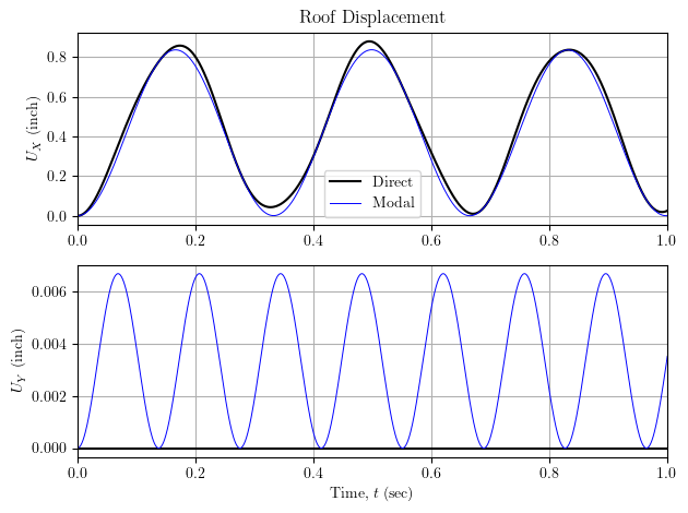 Like in the previous demonstration, we see spurious “out of plane” (Y-direction) displacement response due to the coupling terms in the eigenvectors. For direct integration, the Y-direction displacement is zero, as expected.